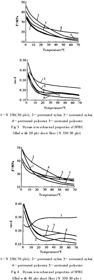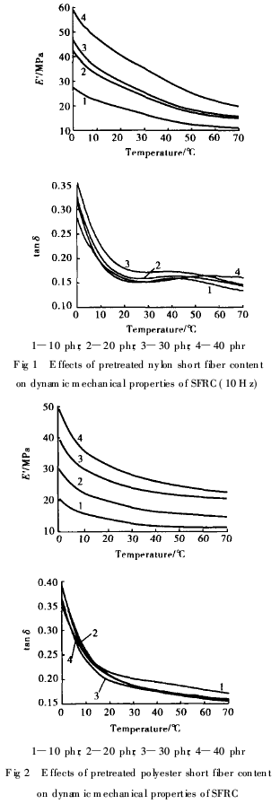填充未處理短纖維的tanδ值大于填充同種預處理短纖維的值(填充20份尼龍短纖維的SFRC相反)。填充聚酯短纖維的SFRC的tanδ隨溫度的升高而降低,而填充尼龍短纖維的SFRC的tanδ在50℃左右出現(xiàn)1個小損耗峰,且峰的位置隨尼龍短纖維用量的增加而向高溫方向移動,這與圖5中尼龍短纖維在60℃附近存在一吸收峰有關。