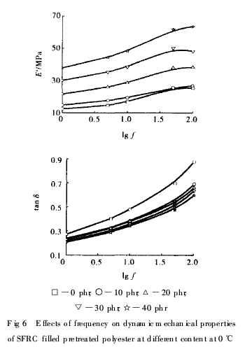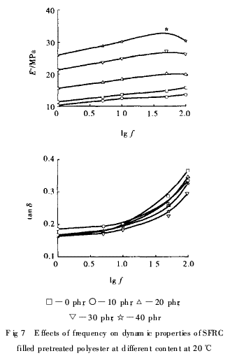 從圖6, 7, 8可以看出,填充10份預處理聚酯短纖維的SFRC在0℃時的E′略大于填充純炭黑硫化膠的E′,而在20℃和60℃時則相反;隨著預處理聚酯短纖維填充量的增加, SFRC的E′明顯增大。因為10份聚酯短纖維在SSBR中還不能形成網(wǎng)絡,從而限制了SFRC的變形,所以增強效果不明顯,而SFRC又比填充純炭黑硫化膠對溫度敏感,所以溫度升高后, SFRC的E′反而小于填充純炭黑硫化膠。SFRC的E′隨頻率的增加基本呈增大趨勢,但溫度越高,在頻率為50 ~100Hz時,聚酯短纖維填充量高的SFRC的E′有減小趨勢。由圖6還可以看出,在0℃時,預處理聚酯短纖維的加入明顯使SFRC的tanδ減小,且其填充量越高, SFRC的tanδ越小。這是因為較低的溫度對聚酯短纖維和橡膠的影響所引起的SFRC的tanδ變化不大, tanδ主要隨聚酯短纖維用量的變化而變化,所以變化較有規(guī)律。提高測試溫度,純炭黑硫化膠的tanδ下降幅度較SFRC更迅速,只有在頻率大于100 Hz時,其值才略高于SFRC。在60℃時,填充純炭黑硫化膠的tanδ進一步降低,降至最低,而預處理聚酯短纖維填充量不同的SFRC的tanδ相差更小。