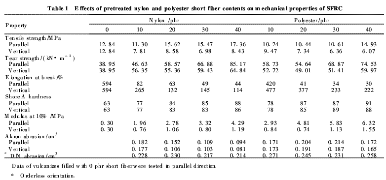 a)短纖維的加入提高了硫化膠的拉伸強(qiáng)度、撕裂強(qiáng)度、10%定伸應(yīng)力及邵爾A型硬度,對(duì)耐磨性也所提高,且尼龍短纖維的增強(qiáng)效果優(yōu)于聚酯短纖維。