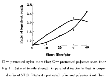 與不加短纖維的炭黑填充膠相比,添加10份尼龍短纖維和10~30份聚酯短纖維的SFRC在平行方向上的拉伸強(qiáng)度略有降低,之后隨填充量的增加,拉伸強(qiáng)度總體呈增長(zhǎng)趨勢(shì),且尼龍短纖維的增強(qiáng)效果優(yōu)于聚酯短纖維。