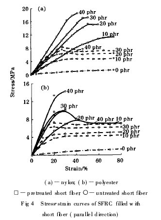 當(dāng)尼龍短纖維和聚酯短纖維的填充量分別為10, 20份時(shí), SFRC在平行方向上的扯斷伸長(zhǎng)率分別從594%迅速降低到82%, 41%,之后變化甚微,這就是短纖維本身形變量小,從而很少被用到大形變橡膠制品中的重要原因。