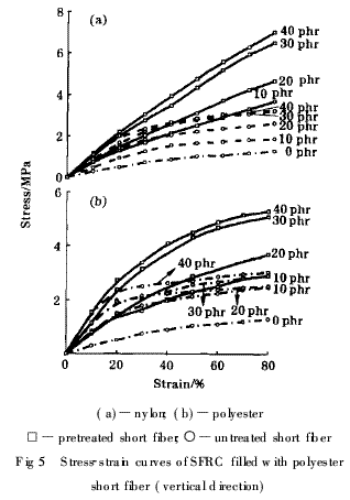 對(duì)于短纖維取向方向平行于拉伸方向的試樣來(lái)說(shuō),由圖4可以看出,隨短纖維填充量的增加,SFRC的定伸應(yīng)力增大,并在相同的形變量時(shí),遠(yuǎn)遠(yuǎn)大于未填充短纖維的硫化膠。當(dāng)短纖維用量增大到一定值時(shí), SFRC出現(xiàn)屈服現(xiàn)象,即試樣被拉伸時(shí)出現(xiàn)1個(gè)或多個(gè)頸縮現(xiàn)象。對(duì)于同種橡膠來(lái)說(shuō),該值視短纖維的種類、與橡膠間的黏合效果及在橡膠中的分散情況而定。當(dāng)填充10份預(yù)處理尼龍短纖維時(shí), SFRC沒(méi)出現(xiàn)應(yīng)力屈服現(xiàn)象;且填充預(yù)處理尼龍短纖維時(shí), SFRC的屈服現(xiàn)象不如填充預(yù)處理聚酯短纖維的SFRC明顯。填充10份預(yù)處理聚酯短纖維時(shí), SFRC屈服后有大形變或類似于細(xì)頸的發(fā)展期,其余填充量的SFRC皆屈服后或屈服早期即斷裂。這可能與短纖維在橡膠基體中形成網(wǎng)絡(luò)時(shí)的填充量有關(guān)。