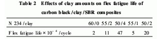 a)用1份或2份黏土分別替代5份炭黑,同時炭黑的替代量分別為5份和10份時,炭黑/黏土/丁苯橡膠納米復合材料與純炭黑增強材料的拉伸強度和撕裂強度相差不大; 300%定伸應力有所降低,扯斷伸長率提高。復合材料的耐磨性能隨炭黑用量的減少而下降,耐屈撓疲勞性能隨黏土用量的增加而增強。