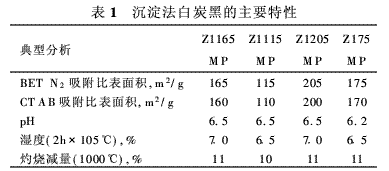 這種橡膠使用的主要填料是稱之為Z1165MP的高分散性白炭黑(Rhodia公司提供)。本研究使用的這種白炭黑和其他白炭黑的某些特性示于表1。我們還將這些白炭黑與N347炭黑進(jìn)行了對比。