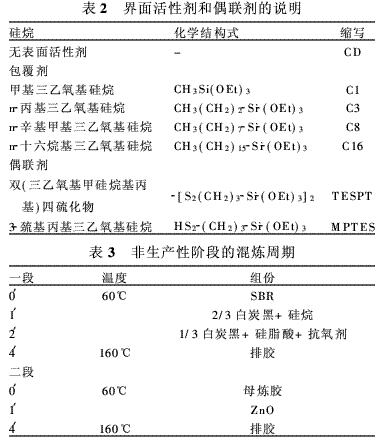 用了如表2所示的包括偶聯(lián)劑(TESPTMPTES)和包覆劑(烷基硅烷)在內(nèi)的若干種表面活性劑。除非另有說明,在配方中采用Si摩爾數(shù)/白炭黑總比表面積比率是恒定的。根據(jù)Wolff所述的最佳重疊理論,該比率接近于1·0~1·2 Si原子/平方納米白炭黑。