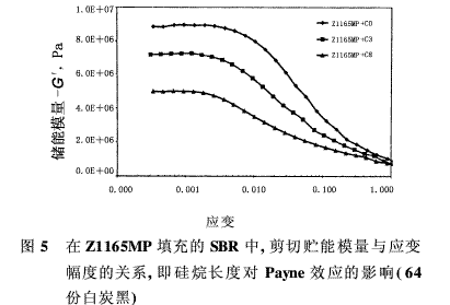 在此情況下,推薦分子機(jī)理,造成Payne效應(yīng)的原因可認(rèn)為是白炭黑表面上橡膠鏈的熱力學(xué)引發(fā)的吸附與解吸附引起的。Payne效應(yīng)的范圍將取決于橡膠能到達(dá)的白炭黑自由(未處理的)表面的大小??磥?在填料表面上大分子鏈段的熱活化解吸附機(jī)理可以用到炭黑填充的SBR中。