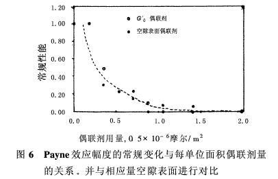 的空隙隨硅烷含量的增加而逐漸下降。當(dāng)使用較多偶聯(lián)劑時,減少苯乙烯也會損害白炭黑-橡膠界面(去濕機(jī)理)。在代表G′0變化和總空隙表面的曲線間獲得了非常好的擬合(校正數(shù)值后)。