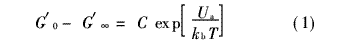 在有關(guān)文獻(xiàn)中通常都認(rèn)為Payne效應(yīng)的幅度是隨溫度的增加而下降。圖7展現(xiàn)了溫度對白炭黑填充SBR的這種影響。隨著溫度的增加,G′0值逐漸降低,而G′∞值則基本上保持恒定。為了證明(熱活化過程是否是引起貯存模量變化的原因),繪制了不含界面劑膠料的阿累尼烏斯活化能圖。根據(jù)下式可觀察出具有不同活化能的兩個截然不同的機(jī)理(圖8):