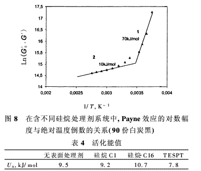 對于不同界面劑的其他體系,在高溫下的活化能也在7~10kJ/mol左右(表4)。對于白炭黑填充的SBR或PDMS,這些值與文獻(xiàn)中報告的值處于同一水平。