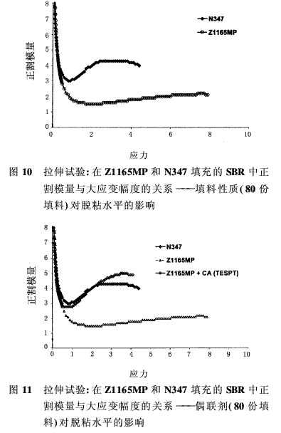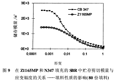 我們將一種炭黑(N347)和沉淀法白炭黑(Z1165MP)進(jìn)行了對比,正如圖9所示,如果用100g橡膠的接觸面積校正貯存模量(G′),炭黑比沉淀法白炭黑引發(fā)更大的Payne效應(yīng)范圍。如果把我們的試驗(yàn)數(shù)據(jù)用于炭黑,這種Payne效應(yīng)則意味著炭黑填料的表面存在著比沉淀法的炭黑具有更多的與橡膠母體連接的有效低能量吸附點(diǎn),這與文獻(xiàn)中關(guān)于炭黑和白炭黑表面能的結(jié)果是一致的。