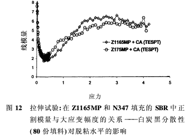 如果穩(wěn)定鍵具高抗耐性,破壞則會出現(xiàn)在母體內(nèi)部,其中的大分子受到很強(qiáng)拉伸,當(dāng)填料與橡膠間的穩(wěn)定鍵破裂時,就可觀察到聚合物和填料表面的脫粘現(xiàn)象。填料變成了產(chǎn)生破壞的一種缺陷。我們認(rèn)為,線模量曲線的急轉(zhuǎn)折處可能是形成這種缺陷的標(biāo)記。出現(xiàn)脫粘時的應(yīng)力則取決粒子的尺寸。所以,在未破裂凝聚集體周圍將首先出現(xiàn)脫粘,這可以從圖12含傳統(tǒng)白炭黑(低分散性)的曲線上清楚地看出。因此,為了獲得良好的最終性能,需要采用分散性良好的白炭黑。