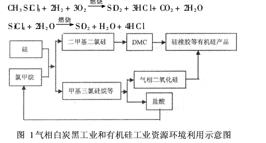 氣相白炭黑新工藝的出現(xiàn),改變了氣相白炭黑工業(yè)的發(fā)展模式,使得氣相白炭黑工業(yè)和有機(jī)硅單體工業(yè)之間的關(guān)系更加密切,它解決了有機(jī)硅單體工業(yè)副產(chǎn)物的處理問題,在氣相白炭黑生產(chǎn)過程中的副產(chǎn)物(鹽酸)可返回有機(jī)硅單體合成車間,用于單體的合成,而生產(chǎn)的氣相白炭黑產(chǎn)品則大部分用于有機(jī)硅產(chǎn)品的后加工,這樣形成了資源的循環(huán)利用。因此,氣相白炭黑生產(chǎn)企業(yè)大多選擇在大型有機(jī)硅單體公司附近設(shè)廠,二者密切合作,相互促進(jìn)發(fā)展。圖1是氣相白炭黑工業(yè)和有機(jī)硅工業(yè)資源循環(huán)利用示意圖,圖1是相互密切關(guān)聯(lián)的有機(jī)硅公司和氣相二氧化硅公司,它們都是相互在附近設(shè)廠,相互促進(jìn)發(fā)展,取得了極好的社會(huì)經(jīng)濟(jì)效益[1]。