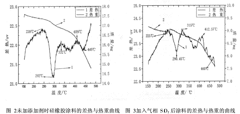 通過與未加任何添加劑涂料的DTA曲線(圖2,圖3所示)相比較可知,涂料的最大分解溫度由300℃降到了288℃,涂料的耐熱性能明顯的變差。這可能是氣相白炭黑表面的羥基引起了涂料基體樹脂的熱穩(wěn)定性變差。溫度達(dá)到450℃以上熱重曲線迅速下降,這說明涂料揮發(fā)比較嚴(yán)重,溫度達(dá)到了涂料的使用極限溫度。這可能是因?yàn)闅庀喟滋亢诒砻鎺в写罅苛u基,隨著溫度的升高一些未反應(yīng)但有活性的羥基再次發(fā)生反應(yīng),在高溫下它可使硅橡膠主鏈發(fā)生降解反應(yīng)。而且氣相SiO2的用量愈大,帶入硅橡膠中的活性羥基愈多,對耐熱性能愈為不利[16]。