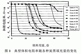 圖1示出含各種炭黑的膠料其典型體積電阻率隨著炭黑填充量變化的情形。從圖中似乎可以看出,所有的電阻率均趨向于達(dá)到一個(gè)類似的漸近極限值,對(duì)于高表面積炭黑,該極限值是在小得多的填充量下獲得的。比較N220炭黑和N375炭黑(這兩者只是表面積不同),很容易就能夠明白比表面積的影響。對(duì)于表面積較高的N220炭黑,與臨界填充量對(duì)應(yīng)的滲透閾值出現(xiàn)在較低的填充量下。滲透閾值位于電阻曲線下降得最厲害之處。然而,結(jié)構(gòu)的影響則無法輕易通過這些測(cè)定來估計(jì)。