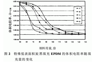 圖2示出比表面積和結(jié)構(gòu)均不同的炭黑,只需增大填充量就能進(jìn)入上部的極限導(dǎo)電區(qū)。因此,在極高的填充量下,聚集體之間空隙的寬度似乎變得非常小,在這方面所有的炭黑品種都相似。因而,這些空隙的電阻可以忽略不計(jì),膠料的導(dǎo)電性主要受炭黑聚集體內(nèi)在導(dǎo)電性的制約。在實(shí)際的操作中,通過混煉時(shí)的粘度及硫化膠的硬度和其他物理性能來確定填充量的上限。