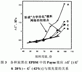 雖然表面積差別并不是很大,但達(dá)到臨界點(diǎn)的填充量卻在65~90份之間變化。對(duì)僅僅是結(jié)構(gòu)不同的炭黑進(jìn)行比較,可以識(shí)別出來一種趨勢(shì)。炭黑的DBP值越高,滲透閾值朝較低的填充量遷移越多(比較炭黑B、C與炭黑D)。為了對(duì)該臨界填料體積現(xiàn)象有更深入透徹的認(rèn)識(shí),用橡膠加工分析儀(RPA)分析了復(fù)數(shù)模量G*的應(yīng)變依賴性。填充硫化膠的應(yīng)變掃描測(cè)定在1·6Hz的頻率下進(jìn)行,單應(yīng)變振幅(SSA)處于0·28%~42%范圍內(nèi)。眾所周知,將填料添加到橡膠中后,低應(yīng)變模量G0的上升比高應(yīng)變模量G∞多,導(dǎo)致稱之為“Payne效應(yīng)G0-G∞”的非線性粘彈行為。由此可以預(yù)期,如果達(dá)到了臨界填充量,在整個(gè)試樣內(nèi)形成填料網(wǎng)絡(luò)。Payne效應(yīng)[G*(0·28%) -G*(42%)]就會(huì)增大到比低填充量時(shí)高得多的程度。這一點(diǎn)可用“力學(xué)活性”填料網(wǎng)絡(luò)的形成來解釋,該網(wǎng)絡(luò)起碼對(duì)小的動(dòng)態(tài)變形是穩(wěn)定的。此時(shí)又出現(xiàn)了這樣的問題:形成電及“力學(xué)活性”滲透閾值的這些臨界濃度,將會(huì)在相同的填充量下獲得嗎?圖3示出了不同填充量下的Payne效應(yīng)??梢苑浅G宄乜闯?當(dāng)填充量在70~80份之間時(shí),表面積最高的炭黑A的Payne效應(yīng)增加相當(dāng)多。將炭黑B、C與表面積相似但結(jié)構(gòu)度不同的炭黑D作比較,DBP值最低的炭黑C只有當(dāng)填充量為90~100份量,Payne效應(yīng)才能夠被檢測(cè)出來。