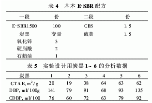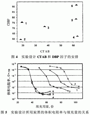 或許應(yīng)該說,至少存在著幾條或一條電阻率足夠低的炭黑路徑,以保證整個(gè)試樣都具有導(dǎo)電性。把炭黑一點(diǎn)點(diǎn)地加入橡膠內(nèi),聚集體將首先被分離開來,然后便形成了單獨(dú)的附聚體(次級(jí)網(wǎng)絡(luò)),最終就會(huì)出現(xiàn)一條通道。此處可能具有導(dǎo)電性———達(dá)到了電滲透閾值,不過它要受幾條也許只是這些通道中的一條制約。通過進(jìn)一步添加填料,就有更多的附聚體產(chǎn)生接觸而形成許多這樣的通道,從而使得導(dǎo)電性進(jìn)一步提高。當(dāng)形成最有可能發(fā)生的接觸,并產(chǎn)生所謂的“連續(xù)填料網(wǎng)絡(luò)”時(shí),就達(dá)到了這個(gè)點(diǎn)———繼而達(dá)到力學(xué)活性滲透閾值。如上所述,現(xiàn)在比較一下圖2和圖3,便可以看出滲透閾值的確不同。炭黑A的電滲透閾值出現(xiàn)在大約65份處(電阻率下降最厲害),而“力學(xué)滲透”則正好出現(xiàn)在大約75份處(Payne效應(yīng)曲線首次急劇上升)。應(yīng)該注意到的是,正如人們對(duì)導(dǎo)電性的認(rèn)識(shí)那樣,達(dá)到“力學(xué)滲透”既沒有引起模量增大數(shù)十倍,也沒有造成最終的G*的平直部分?!傲W(xué)滲透閾值”這個(gè)名稱是一個(gè)創(chuàng)造,其基礎(chǔ)僅僅是可觀察到一定填充量時(shí)ΔG*顯著增大這一事實(shí)。對(duì)炭黑D也能夠看到類似的行為:電滲透閾值為85份左右,而“力學(xué)滲透”閾值約為95份。對(duì)于其余的兩種炭黑,情況不如前面所述的那么清楚。不過,在這里可以指出的是,對(duì)于膠料的導(dǎo)電性來說,似乎只需要少量結(jié)合的炭黑聚集體的通道;而對(duì)于力學(xué)活性填料網(wǎng)絡(luò),則必須有通過整個(gè)試樣的連續(xù)三維附聚體產(chǎn)生。至于比表面積和結(jié)構(gòu)對(duì)電滲透閾值的影響(相應(yīng)地對(duì)臨界填料量的影響)的更詳細(xì)分析,采用了更為基本的配方(表4)。選擇準(zhǔn)正交的實(shí)驗(yàn)設(shè)計(jì)來把這些主要參數(shù)的影響區(qū)分開。為了獲得中心點(diǎn)與這些因子有關(guān)的準(zhǔn)正交的設(shè)計(jì),如圖4中所示選擇作為研究對(duì)象的炭黑。所用炭黑的分析數(shù)據(jù)見于表5。