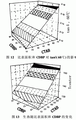 填充橡膠膠料的tanδ(60℃)和生熱分別示于圖12和圖13