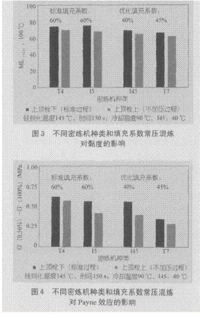 (1)常壓混煉——硅烷化這一步在常壓即密煉機上頂栓抬起不加壓的情況下進行。為了改善進料性能、硅烷化效率和密煉機能力,對填充系數(shù)進行了優(yōu)化;
