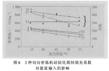 填充系數(shù)會影響硅烷化的效率(圖5)。填充系數(shù)越小,混煉室內(nèi)產(chǎn)生的乙醇總量越少,能蒸發(fā)而進入混煉室內(nèi)的乙醇的自由體積越大。另外,也因填充系數(shù)較低,部分膠料通過轉(zhuǎn)子和內(nèi)壁之間間隙的頻率也較高。膠料薄通出片可達更高的程度,膠料蒸發(fā)出的乙醇量也增加。由于與切向型密煉機相比其進料性能更不正常,填充系數(shù)對儲能模量的影響在嚙合密煉機中更加明顯。因此,通過調(diào)節(jié)填充系數(shù)和改善進料性能所獲得的好處,對嚙合型密煉機來說更大。在3種密煉機構(gòu)形之間,未發(fā)現(xiàn)Payne效應和黏度水平有重大的差別,但是能量輸入率的趨勢變化則相當大(圖6)。對于帶ZZ2-構(gòu)形(T4)的切向型密煉機,能量輸入只受填充系數(shù)輕微影響,其結(jié)果是旋轉(zhuǎn)的絕對轉(zhuǎn)數(shù)隨著填充系數(shù)的提高僅略有降低。對帶F4 W-構(gòu)形的切向型密煉機(T7),發(fā)現(xiàn)了另一種極端的現(xiàn)象:硅烷化期間的總轉(zhuǎn)數(shù)及能量輸入,兩者均隨著填充系數(shù)的提高而急劇減小。這種密煉機的能量吸收的總水平最低。在該系列的密煉機中,帶F4 W-轉(zhuǎn)子的密煉機的效率最高;散失到混煉室的能量少,剪切力高。