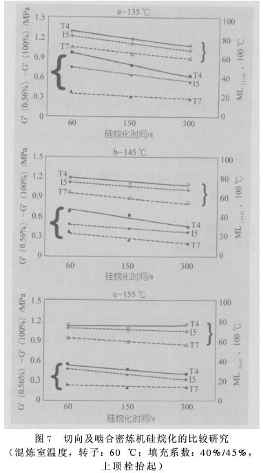 對3種不同的密煉機型號(T7、T4、I5)進行了比較研究。圖7a~c所示的是在完全硅烷化過程中,切向F4W-密煉機(T7)在研究的所有溫度水平(135~155℃)下給出了最佳結(jié)果;在類似的操作條件下,該類轉(zhuǎn)子的黏度及P a y n e效應最低。尤其是在硅烷化的初期(溫度水平低,硅烷化時期短),這種密煉機的運行效果要好得多。嚙合型密煉機在2種切向型密煉機之間處于居中位置。當硅烷化反應繼續(xù)進行時(硅烷化時間更長,硅烷化溫度更高),3種密煉機之間Pa y n e效應的差異逐漸縮小。與此類似,黏度減小了,但不同密煉機的值并未會聚于一點。