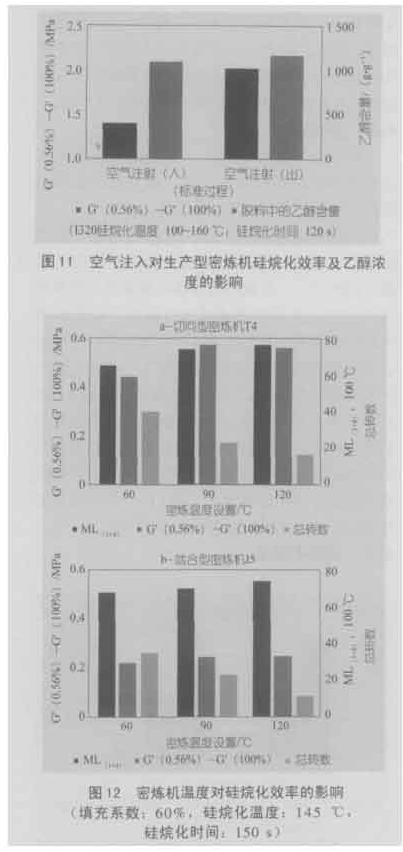 提高乙醇排除率的另一項措施是在硅烷化這一步時向密煉機注入空氣。首先在實驗室內(nèi)以較大規(guī)格設(shè)備(I45)進行了一系列試驗。空氣從密煉機底部注入,沒有考慮專門注入空氣的出口。在標準條件下將膠料加熱至硅烷化溫度(145℃)。當膠料達到這一溫度后,即開始注入空氣,并對轉(zhuǎn)子速度進行調(diào)節(jié),以便保持硅烷化所需要的溫度。圖10示出該膠料的性能以及與相同條件下(除切斷空氣注入外)硅烷化膠料性能的比較。空氣注入降低了Pa y n e效應、黏度及膠料內(nèi)的水分含量,乙醇排除更為有效。這些結(jié)果得到了生產(chǎn)型設(shè)備中320 L密煉機內(nèi)混煉的一系列膠料的驗證。注入空氣時硅烷化的效率也明顯高得多(圖11)。所有的其他性能與標準白炭黑膠料的性能差不多。