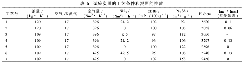 試驗(yàn)炭黑的工藝條件和炭黑的性質(zhì)參見表6。為了向反應(yīng)區(qū)內(nèi)提供富氫氣氛,工藝號(hào)1、3、4和6是以氨氣作為氫源,添加到反應(yīng)爐的高溫反應(yīng)區(qū)中。為了說明這種加氫的效果,表中也列出未添加氨的工藝號(hào)2、5和7的試驗(yàn)結(jié)果作為對(duì)照。