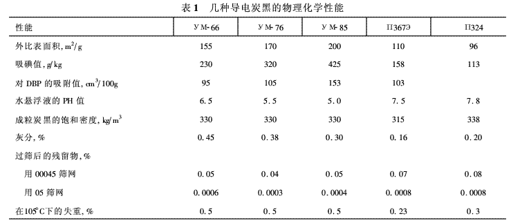 長久以來,作為能夠賦予彈性體高導(dǎo)電性能的專用牌號炭黑,人們都采用了乙炔炭黑。從上一世紀80年代起,為此目的開始使用牌號為П367Э和П267Э的炭黑。然而,目前因其價格昂貴,這幾中牌號的炭黑對橡膠工業(yè)來說實際上是用不起的。因此,開發(fā)產(chǎn)量大、價格低廉的導(dǎo)電橡膠用填充劑的生產(chǎn)工藝勢在必行。俄羅斯鄂木斯克市《Химпласт》股份有限公司1994年起用高芳構(gòu)原料熱氧化分解法制造УМ-66炭黑(ТУ38 1001-94),從2001年起生產(chǎn)УМ-76炭黑(ТУ1002-02)和УМ-85炭黑。從物理化學(xué)特性來看(表1),這幾種牌號的炭黑完全能夠滿足彈性體導(dǎo)電的要求。