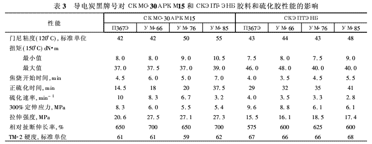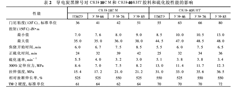 為了研究各種牌號炭黑對膠料的粘度、硫化、物理機械性能及電氣特性的影響,用實驗室開煉機ЛБ320 160/160,按標準工藝和配方制備了以СКН-18СМ、СКН-40КТН、СКМС-30АРКМ15和CKЭПТЭНБ為基礎(chǔ)的膠料,炭黑含量的變量范圍為20質(zhì)量份~60質(zhì)量份(對100質(zhì)量份粘合性彈性體)。用液壓平板硫化機在150°C下硫化膠料。在上述生膠中填充了40質(zhì)量份炭黑的膠料的性能如表2、表3所示。用剪切型門尼粘度計在120°C下和孟山都(Monsanto)硫化儀在150°C下測定了膠料的粘度和硫化參數(shù)。