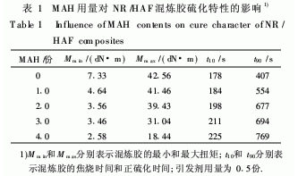 采用P3555B2型盤式硫化儀測定膠料的硫化時間,可得到有關(guān)膠料硫化特性的一系列信息.當(dāng)引發(fā)劑DCP用量為0·5份時,膠料硫化特性參數(shù)隨MAH用量的變化情況見表1.