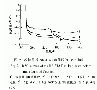 熱穩(wěn)定性分析參照文獻(xiàn)[9]的方法進(jìn)行.NR/HAF和MAH改性NR/HAF硫化膠的差示掃描量熱(DSC)測試分析結(jié)果見圖2.從圖中可以看出,未改性的NR與HAF復(fù)合材料硫化膠的Tg為214·96K,而3份MAH和0·5份BPO改性的NR與HAF復(fù)合材料硫化膠的Tg為214·93K;用3份