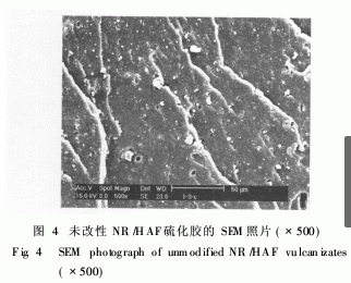 圖4是未改性的NR與HAF混煉膠硫化膠斷面放大500倍的掃描電鏡照片,可以看出,硫化膠中炭黑粒子分布不均勻,有較大團(tuán)塊出現(xiàn),斷面有較多因炭黑脫除留下的光滑孔洞.