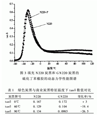 圖2和表1是用綠色炭黑與商業(yè)N330炭黑補(bǔ)強(qiáng)的硫化天然橡膠的動態(tài)力學(xué)圖譜及特征溫度下的tanδ數(shù)據(jù)表,其中GN330為綠色N330炭黑,變化率為采用綠色炭黑代替商品N330炭黑后,特征tanδ的變化率??梢钥闯?綠色炭黑比商業(yè)N330炭黑60℃的tanδ值明顯降低約20%,說明改性明顯降低了N330炭黑的滾動阻力;同時膠料90℃的tanδ值降低約17.6%,說明綠色炭黑的使用使膠料的疲勞生熱大幅降低。2.3綠色炭黑N220對硫化丁苯橡膠動態(tài)力學(xué)性能的影響