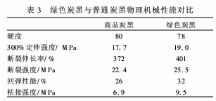 表3所列數(shù)據(jù)是分別采用普通炭黑、綠色炭黑的天然橡膠膠料的物理機(jī)械性能對比??梢钥闯?對于同樣的配方,用綠色炭黑代替普通商業(yè)炭黑后,硫化膠的斷裂強(qiáng)度、斷裂伸長率、300%定伸應(yīng)力、回彈性、與金屬粘合強(qiáng)度均有明顯提高,硬度略有降低。