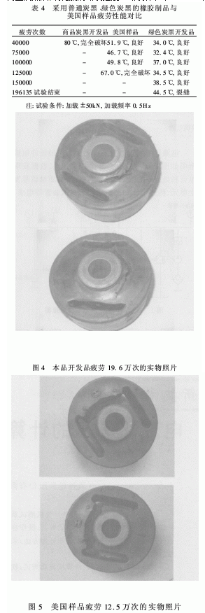 圖4、5是采用綠色炭黑開發(fā)的某橡膠制品與美國樣品疲勞實驗后的實物照片??梢?采用綠色炭黑的橡膠制品,最大生熱比采用普通炭黑降低約44%以上,疲勞壽命提高約5倍;與美國樣品相比,最大生熱降低33%以上,疲勞壽命提高50%以上。