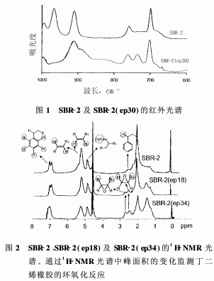 與參照譜圖比較, SBR-2 (ep18)和SBR-2(ep34)在2·45和2·7給出兩個(gè)新信號(hào),這分別為順式與反式環(huán)氧基。隨著環(huán)氧化程度提高,兩個(gè)環(huán)氧基信號(hào)增強(qiáng),同時(shí)1,4-順式及反式丁二烯單元信號(hào)減弱。但是,實(shí)際上乙烯基信號(hào)的面積保持不變,這再一次證實(shí)了早先在BR環(huán)氧化中觀察到的1,2位的雙健反應(yīng)性降低。