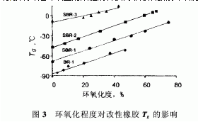 SBR及BR的Tg隨環(huán)氧化程度增加而增加。聚合物鏈環(huán)氧化時(shí),鏈間強(qiáng)的相互作用導(dǎo)致鏈移動(dòng)性降低。
