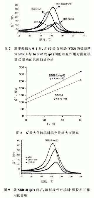 2·2·2 橡膠-填料的相互作用(玻璃轉(zhuǎn)化區(qū)域)下面討論由恒定形變振幅和頻率下進(jìn)行溫度掃描而得的沉淀法白炭黑對(duì)未改性的SBR及SBR-2(ep7)動(dòng)態(tài)機(jī)械復(fù)模量(儲(chǔ)能模量G′與損耗模量G″)的影響。如同早期發(fā)表的文獻(xiàn)所討論的,有關(guān)橡膠-填料相互作用的有用數(shù)據(jù)可以由填充膠料在玻璃轉(zhuǎn)化區(qū)域損耗模量的溫度依賴性推導(dǎo)出來(lái)。最大減振面積給出了每單位體積試樣從剛性玻璃態(tài)到彈性橡膠態(tài)轉(zhuǎn)化過(guò)程中能量的耗散。如果體系發(fā)生填料-橡膠的相互作用,則填料基體界面的聚合物鏈段部分被固定。所以,由于相連的聚合物鏈的作用,玻璃轉(zhuǎn)化過(guò)程中能量耗散的增加高于未填充試樣。該增加緣于兩方面:被固定的聚合物層的體積分?jǐn)?shù)及填料-基體相互作用的強(qiáng)度。因而,通過(guò)監(jiān)測(cè)玻璃轉(zhuǎn)化區(qū)域最大減振幅度(或面積)的增加,最少可以推導(dǎo)出與填料-基體相互作用相等量的數(shù)據(jù)資料