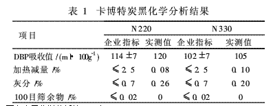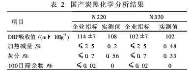 從表2看出國(guó)產(chǎn)炭黑化學(xué)分析結(jié)果符合技術(shù)指標(biāo)。DBP吸收值偏中下限,灰分、水分相對(duì)較大。