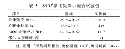 為了減小隨機(jī)誤差或系統(tǒng)誤差,物理測(cè)試時(shí)都硫化了雙片,結(jié)果均為平均值。同時(shí)做了3#參比炭黑小配合實(shí)驗(yàn),以了解在實(shí)驗(yàn)中誤差的大小。參比炭黑物理測(cè)試結(jié)果見表5。