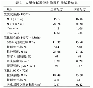 從表2可以看出,實驗配方中加入硅烷偶聯(lián)劑/白炭黑/炭黑補強體系后,從硫變儀數(shù)據(jù)可以看出小轉(zhuǎn)矩、大轉(zhuǎn)矩、焦燒時間都有所增加,從而保證了后續(xù)加工的安全性。從硫化膠的物性結(jié)果看定伸應力、強度、硬度等指標均有提高,由于翻斗車使用路面比較苛刻,這就要求胎面膠具有耐切割、耐刺扎、抗崩花掉塊耐磨耗、硬度高等特點,由于實驗配方中補強體系的作用,硫化膠的各項指標明顯高于正常生產(chǎn)配方。所以說從小配合實驗結(jié)果看,實驗配方能夠滿足翻斗車的使用要求。