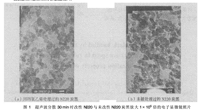圖1是超聲波分散30 min時(shí)N220炭黑改性前后放大1×105倍的電子顯微鏡掃描照片。由圖1(a)可見,用四氯乙烯處理過的N220炭黑粒子被均勻地分散開來,而未被處理過的N220粒子則密密地堆積在一起,由此可以解釋混煉時(shí)吃粉時(shí)間縮短的原因: