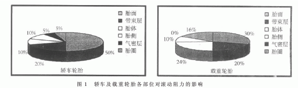 人們對(duì)輪胎的基本要求有三。一是具有較高的濕路面的抓著力(抗?jié)窕?或較好的牽引性,以確保車輛行駛及人員的安全;二是滾動(dòng)阻力小,以節(jié)省燃油并減少?gòu)U氣的排放。一般輪胎滾動(dòng)阻力每降低3%~4%,耗油量可減少1%?;谔ッ娴臐L動(dòng)阻力約為轎車輪胎的50%,載重輪胎的30%,因此降低胎面的滾動(dòng)阻力是節(jié)省燃油的重要途徑。轎車及載重輪胎各部位對(duì)滾動(dòng)阻力的影響見圖1;三是耐磨性好,使用壽命長(zhǎng)。為了獲得上述性能,白炭黑特別是高分散性白炭黑在胎面膠中的應(yīng)用是必不可少的。