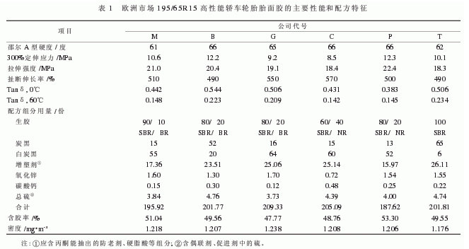 北京橡膠工業(yè)研究設(shè)計(jì)院曾對(duì)國(guó)外多種類型和規(guī)格輪胎的胎面膠進(jìn)行剖析,歐洲市場(chǎng)195/65R15高性能轎車輪胎胎面膠的主要性能和配方特征見表1。從表1中可以看出:胎面膠在60℃時(shí)的tanδ與白炭黑的用量相關(guān),即白炭黑的用量越多,60℃時(shí)的tanδ越低,也就是滾動(dòng)阻力越低。目前,白炭黑在轎車輪胎胎面中的用量最多為65份。