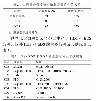 高分散性白炭黑(HDS)是一種具有高分散性且無粉塵的白炭黑產(chǎn)品,適用于“綠色”輪胎。易分散性白炭黑(EDS)是20世紀(jì)90年代中期開發(fā)的一種性能介于HDS和常規(guī)白炭黑之間的產(chǎn)品,其價(jià)格較HDS低,是一種性價(jià)比較好的替代HDS的產(chǎn)品。填充常規(guī)白炭黑的膠料,濕牽引性好,滾動(dòng)阻力低,但耐磨性很不好。采用HDS或EDS后,由于白炭黑在膠料中分散狀況較好,可以顯著提高輪胎的耐磨性。白炭黑分散度和輪胎胎面耐磨性的關(guān)系見表2。