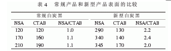 最近德固賽公司又研究開發(fā)了被稱為第三代白炭黑產(chǎn)品的“獨(dú)特結(jié)構(gòu)的高分散性白炭黑”,其分散性和補(bǔ)強(qiáng)性更好,該公司在介紹這種白炭黑的文章中,將上文所述的HDS和EDS產(chǎn)品統(tǒng)稱為第二代白炭黑。這種白炭黑的性能特征是:(1)NSA顯著高于CTAB比表面積常規(guī)產(chǎn)品和新型產(chǎn)品表面的比較見表4。
