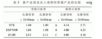 采用壓汞法可以測(cè)出這種新產(chǎn)品多孔而可塑,它比常規(guī)白炭黑有多得多的孔隙和大孔容積,導(dǎo)致其NSA與CTAB比表面積有不尋常的比值,并有相當(dāng)高的結(jié)構(gòu)。新產(chǎn)品的汞壓入容積同常規(guī)產(chǎn)品的比較見表5。表5顯示出新產(chǎn)品同常規(guī)產(chǎn)品的孔隙容積比較,結(jié)構(gòu)越高越容易被橡膠分子滲入,分散就更好。