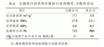 據(jù)報(bào)道,上海九琛精細(xì)化工有限公司研制成功了無凝膠高分散性白炭黑產(chǎn)品,其特征是不含200目水洗篩余物,填充這種產(chǎn)品的硫化膠中不出現(xiàn)白點(diǎn)。該公司用其產(chǎn)品和國(guó)內(nèi)某家大公司的產(chǎn)品進(jìn)行了對(duì)比,無凝膠白炭黑和有凝膠白炭黑物性、分散性對(duì)比見表6。