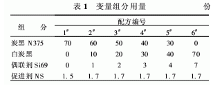 SIBR 100,氧化鋅 4,硬脂酸 2,軟化劑8,防老劑 3.5,硫黃 1.5,炭黑N375、白炭黑、偶聯(lián)劑Si69、促進劑NS 變量(見表1,其中炭黑N375和白炭黑總用量為70份),其它 2.2。