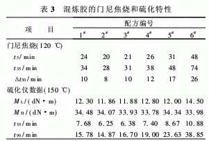 門尼粘度和門尼松弛反映膠料的加工性能。門尼粘度小及門尼松弛時間(t70,t80和t90)短、應(yīng)力松弛面積A(由截距k和斜率a計算得出)小,膠料的加工性能好。白炭黑等量替代炭黑對混煉膠門尼粘度和門尼松弛的影響見表2。從表2可以看出,白炭黑部分和完全替代炭黑的混煉膠門尼粘度稍有增大,門尼松弛時間t70和t80不變,t90稍有延長;白炭黑部分替代炭黑的混煉膠A稍有增大,完全替代炭黑的混煉膠A顯著增大,這表明白炭黑等量替代炭黑,尤其是完全替代炭黑的膠料加工性能變差。